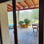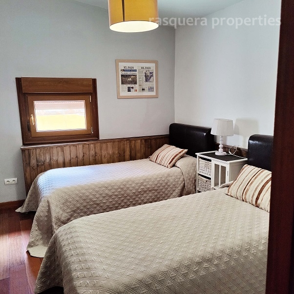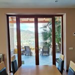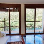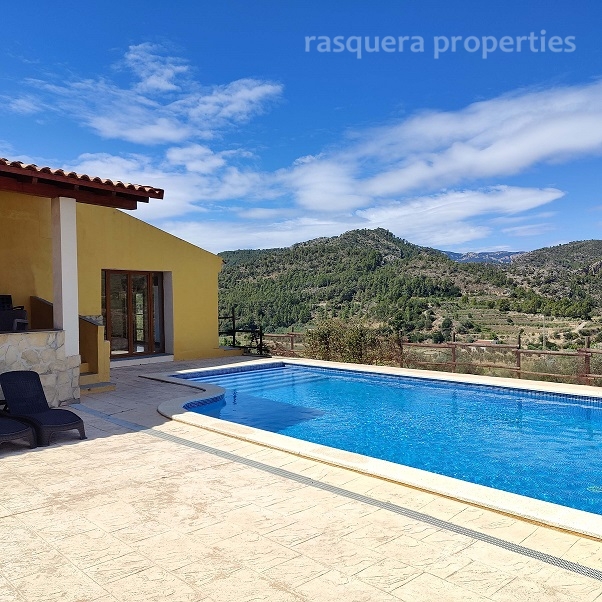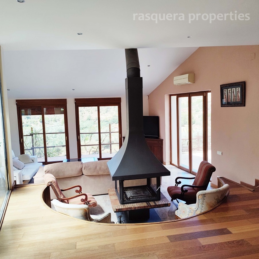 A glass panelled door from the kitchen opens into the light filled split-level living room with a large wood burner at its centre. To the back of the room on a raised teak floor is the dining area with views and access to the terrace and tiled pool and BBQ area.